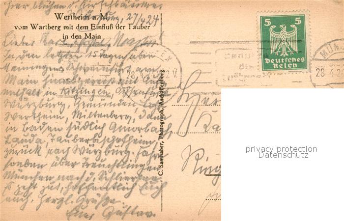 73553557 alte Postkarte Wertheim Main Panorama Blick vom Wartberg mit Tauber und Main postalisch gelaufen Erhaltung siehe scans [FriedD77] KatCode: 11110008128131