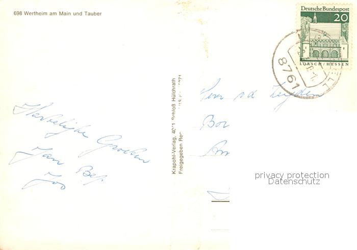 73166439 alte Postkarte Wertheim Main Stadtpanorama mit Main und Tauber Fliegeraufnahme postalisch gelaufen Erhaltung siehe scans [FriedD77] KatCode: 11110008128131