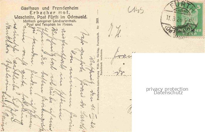 74101226 alte Postkarte Weschnitz Fuerth Hessen Gasthaus Fremdenheim Erbacher Hof Blick ins Weschnitztal postalisch gelaufen Erhaltung siehe scans [WerneD78] KatCode: 11110006431007