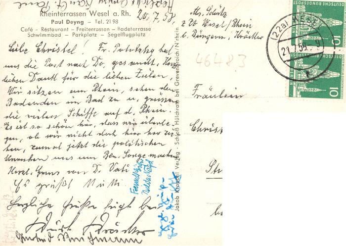 73870734 alte Postkarte Wesel Rhein Rheinterrassen Cafe Restaurant Freiterrassen Weserbruecke Freibad postalisch gelaufen Erhaltung siehe scans [FriedD77] KatCode: 11110005170048