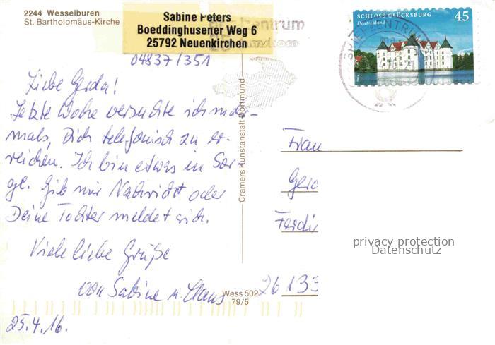 74137670 alte Postkarte Wesselburen Dithmarschen Schleswig-Holstein St Bartholomaeus Kirche postalisch gelaufen Erhaltung siehe scans [WerneD78] KatCode: 11110001051127