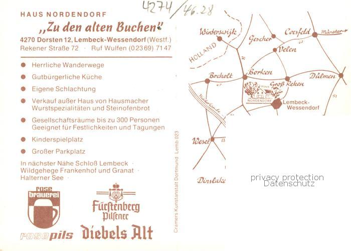 73867350 Wessendorf Lembeck Haus Nordendorf Zu den alten Buchen Hotel Restaurant Werbung Rose-Brauerei postalisch nicht gelaufen Werbekarte (keine Postkarte) Erhaltung siehe scans [FriedD77] Werbekarte (keine Postkarte) Frie Katcode 11110005562012
