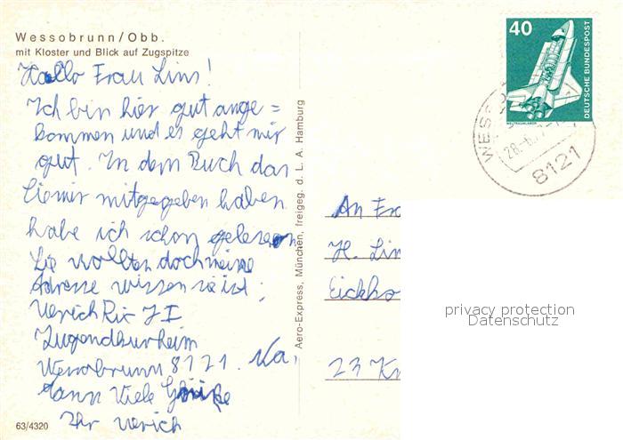 72758890 alte Postkarte Wessobrunn Fliegeraufnahme mit Kloster und Zugspitze postalisch gelaufen Erhaltung siehe scans [WerneD78] KatCode: 11110009190158