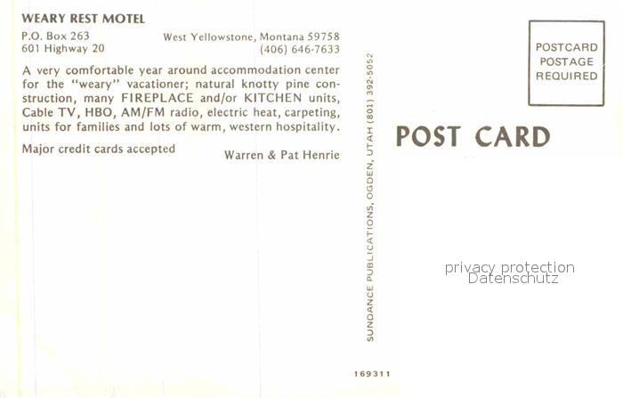 12869874 West Yellowstone Weary Rest Motel postalisch nicht gelaufen Erhaltung siehe scans [PaolaD17] KatCode: 14140280000000