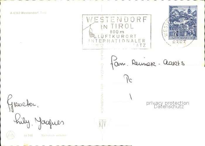 72582423 alte Postkarte Westendorf Tirol Dorfpartie Kirche postalisch gelaufen Erhaltung siehe scans [WerneD78] KatCode: 11390335070420