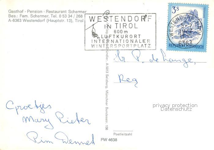 73123450 alte Postkarte Westendorf Tirol Gasthof Pension Restaurant Schermer postalisch gelaufen Erhaltung siehe scans [KathaD81] KatCode: 11390335070420