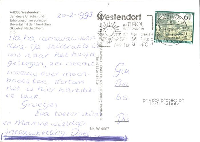 72092219 alte Postkarte Westendorf Tirol Panorama Ortsblick Skilaeufer Pferdeschlitten postalisch gelaufen Erhaltung siehe scans KatCode: 11390335070420
