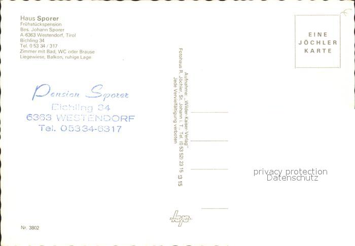 71902051 Westendorf Tirol Pension Sporer postalisch nicht gelaufen Erhaltung siehe scans KatCode: 11390335070420