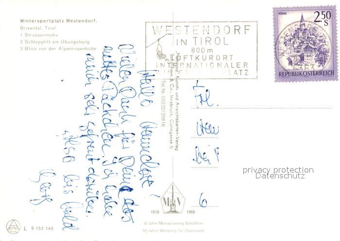 73590371 alte Postkarte Westendorf Tirol Wintersportplatz Alpen Skilift Berghuetten Motiv mit Kirche postalisch gelaufen Erhaltung siehe scans [FriedD77] KatCode: 11390335070420