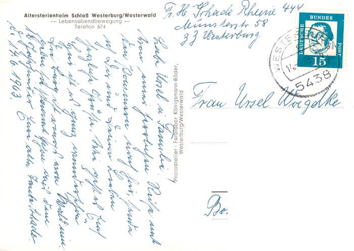 73885787 alte Postkarte Westerburg Westerwald Altersferienheim Schloss Weserburg Panorama Terrasse Gastraum postalisch gelaufen Erhaltung siehe scans [FriedD77] KatCode: 11110007143308