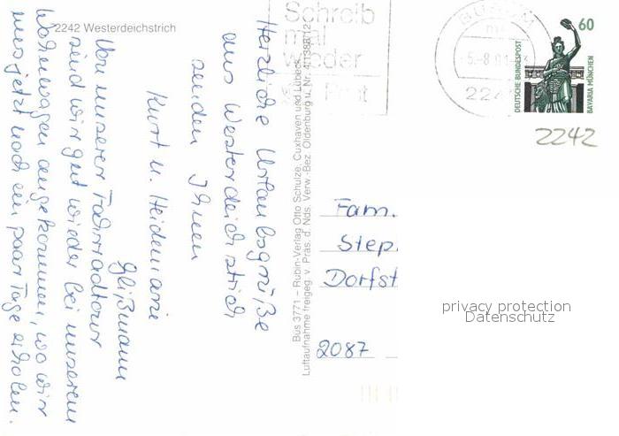 72897486 alte Postkarte Westerdeichstrich Muehle Fliegeraufnahme Reetdachhaus Am Wehl Strandleben postalisch gelaufen Erhaltung siehe scans [WerneD78] KatCode: 11110001051132