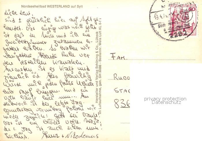 73026431 alte Postkarte Westerland Sylt Fliegeraufnahme postalisch gelaufen Erhaltung siehe scans [KathaD81] KatCode: 11110001054151