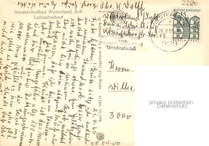 73680822 alte Postkarte Westerland Sylt Fliegeraufnahme mit Strand postalisch gelaufen Erhaltung siehe scans [LiesaD40] KatCode: 11110001054151