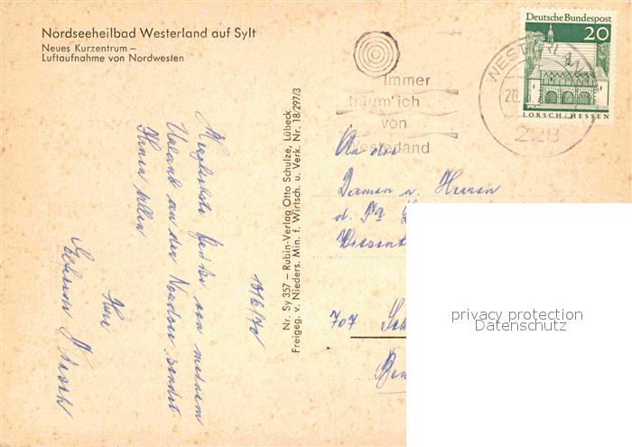 72852088 alte Postkarte Westerland Sylt Fliegeraufnahme neues Kurzentrum postalisch gelaufen Erhaltung siehe scans [NatalD47] KatCode: 11110001054151