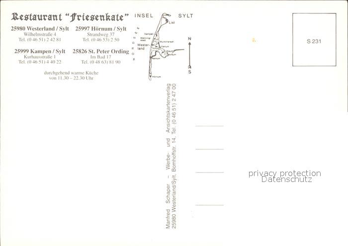 72535427 Westerland Sylt Hoernum Kampen St. Peter Ording Restaurant Friesenkate postalisch nicht gelaufen Erhaltung siehe scans [LiesaD40 kt120box] KatCode: 11110001054151