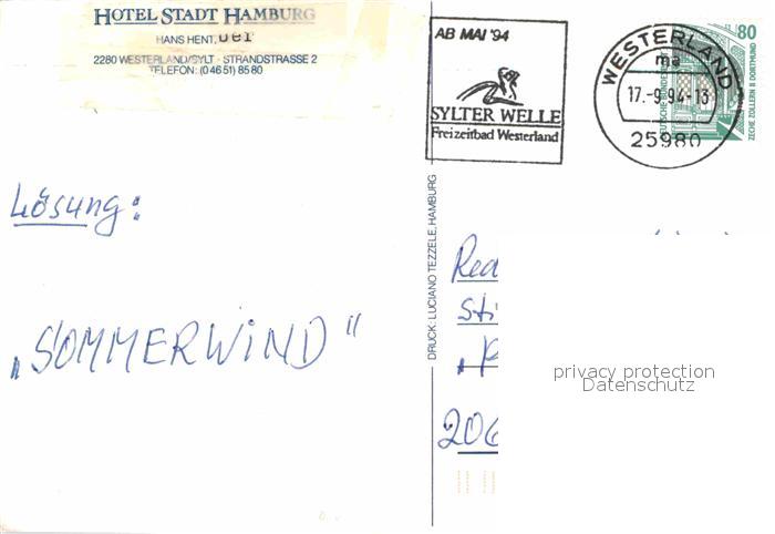 72854818 alte Postkarte Westerland Sylt Hotel Stadt Hamburg postalisch gelaufen Erhaltung siehe scans [AndreD76] KatCode: 11110001054151