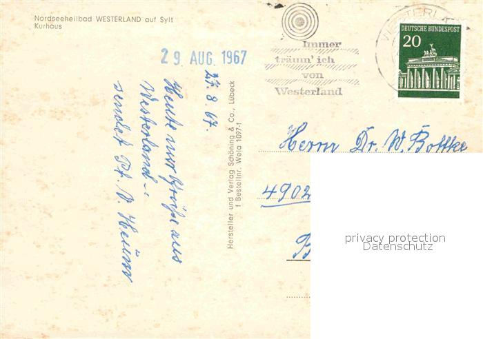 72829522 alte Postkarte Westerland Sylt Kurhaus postalisch gelaufen Erhaltung siehe scans [NatalD47] KatCode: 11110001054151