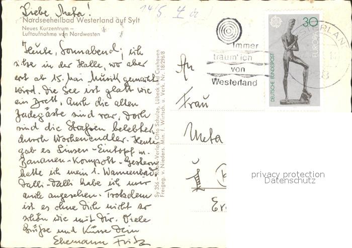 71987904 alte Postkarte Westerland Sylt Kurzentrum Fliegeraufnahme postalisch gelaufen Erhaltung siehe scans KatCode: 11110001054151
