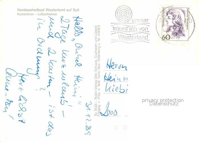 72780930 alte Postkarte Westerland Sylt Kurzentrum Nordseeheilbad Fliegeraufnahme postalisch gelaufen Erhaltung siehe scans [FriedD77] KatCode: 11110001054151