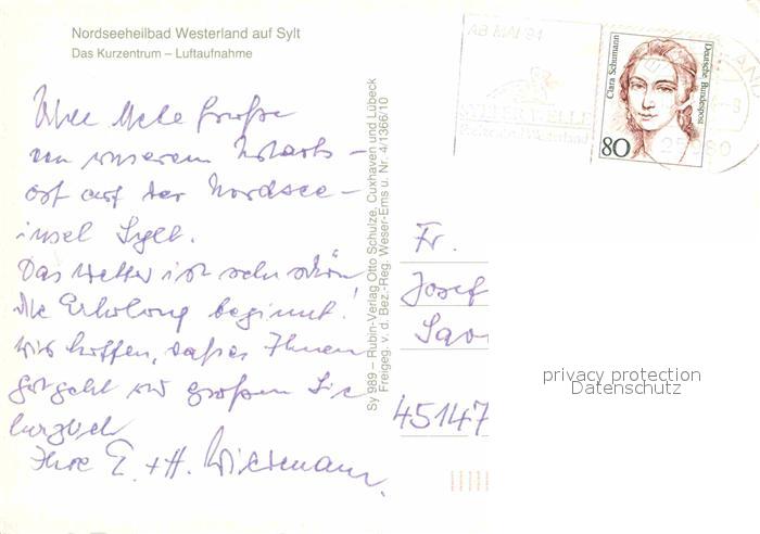 72771013 alte Postkarte Westerland Sylt Kurzentrum Nordseeheilbad Fliegeraufnahme postalisch gelaufen Erhaltung siehe scans [FriedD77] KatCode: 11110001054151