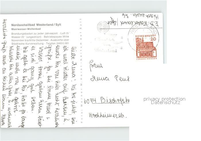 72362239 alte Postkarte Westerland Sylt Meerwasser Wellenbad postalisch gelaufen Erhaltung siehe scans KatCode: 11110001054151