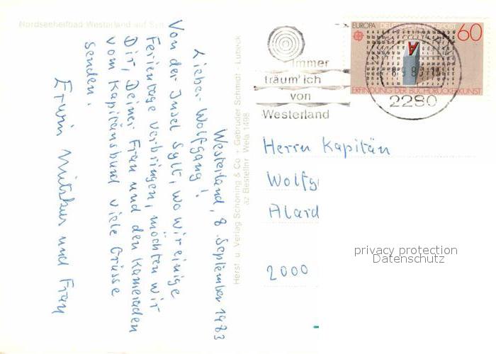 72639688 alte Postkarte Westerland Sylt Musikmuschel Dicke Wilhelmine Brunnenskulptur Strand Promenade Spielcasino Friedrichstrasse postalisch gelaufen Erhaltung siehe scans [FriedD77] KatCode: 11110001054151