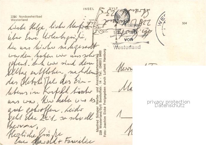 73637821 alte Postkarte Westerland Sylt Nordseeheilbad Fliegeraufnahme postalisch gelaufen Erhaltung siehe scans [FriedD77] KatCode: 11110001054151