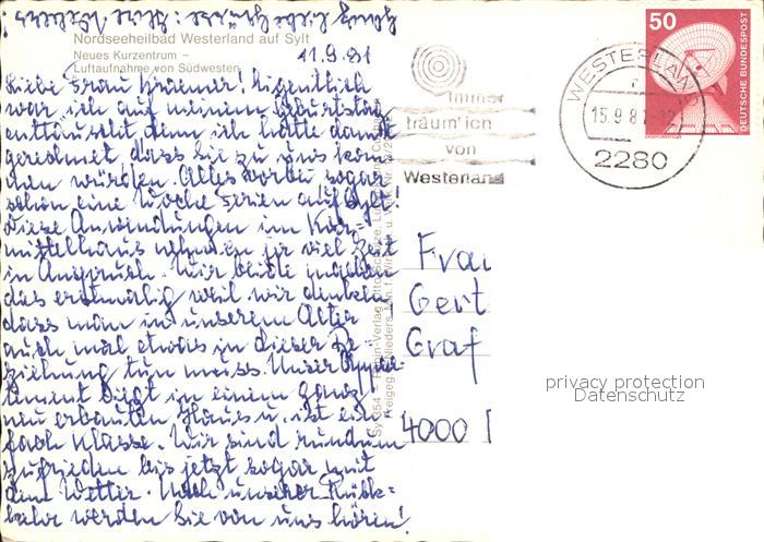 72600481 alte Postkarte Westerland Sylt Nordseeheilbad Neues Kurzentrum Fliegeraufnahme postalisch gelaufen Erhaltung siehe scans [FriedD77] KatCode: 11110001054151
