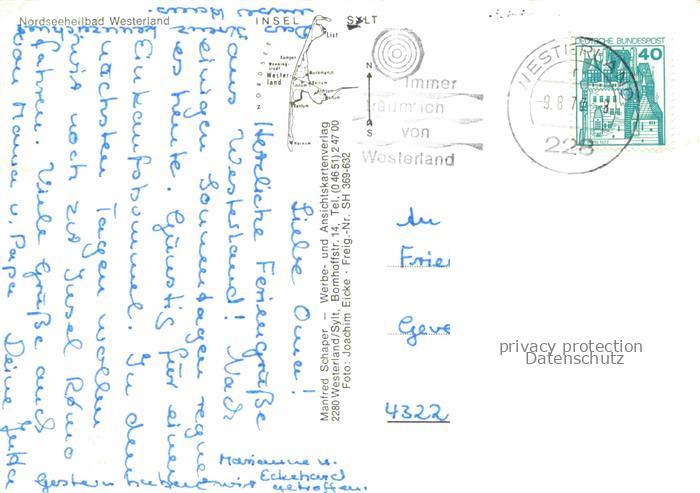 74156927 alte Postkarte WESTERLAND Sylt Nordseeheilbad Sylt Strand Nordsee Hochhaeuser Strandkoerbe Wohngebiet postalisch gelaufen Fliegeraufnahme Erhaltung siehe scans [Karloger] KatCode: 11110001054151