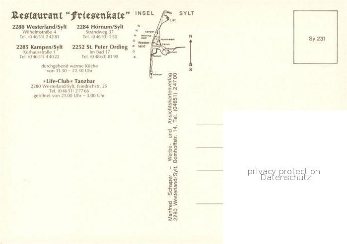 73119742 Westerland Sylt Restaurant Friesenkate postalisch nicht gelaufen Erhaltung siehe scans [LiesaD40] KatCode: 11110001054151