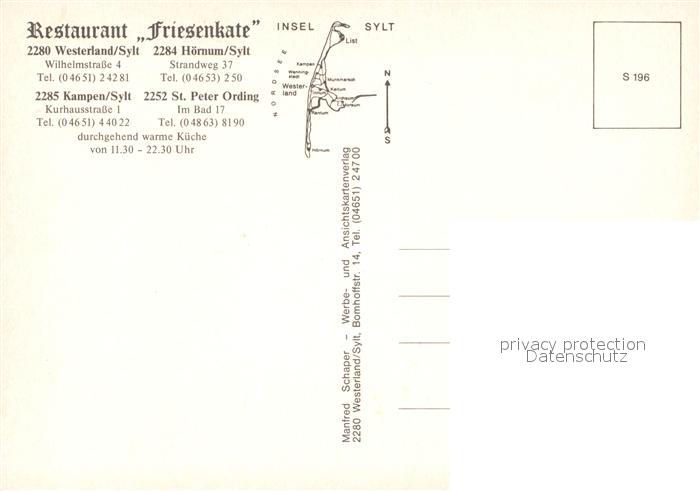 73569296 Westerland Sylt Restaurant Friesenkate H?rnum Kampen St. Peter Ording postalisch nicht gelaufen Erhaltung siehe scans [PaolaD17] KatCode: 11110001054151