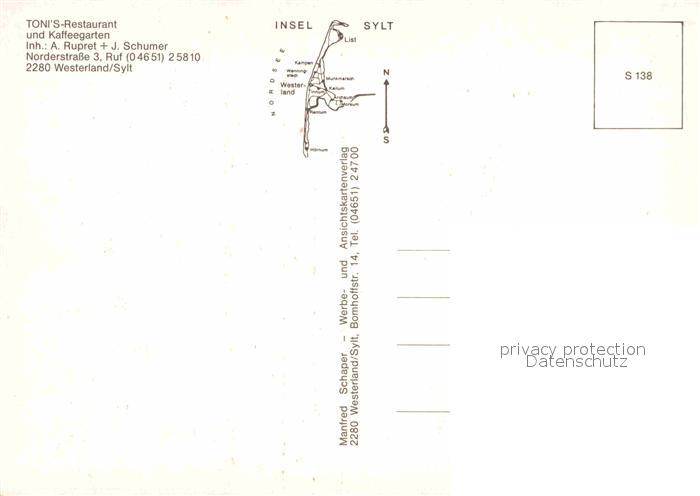 72673784 Westerland Sylt Tonis Restaurant postalisch nicht gelaufen Erhaltung siehe scans [AndreD76] KatCode: 11110001054151