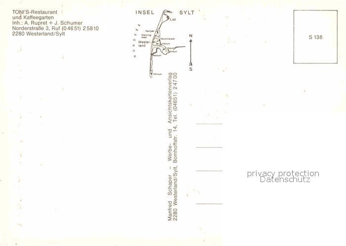 72672945 Westerland Sylt Tonis Restaurant postalisch nicht gelaufen Erhaltung siehe scans [AndreD76] KatCode: 11110001054151
