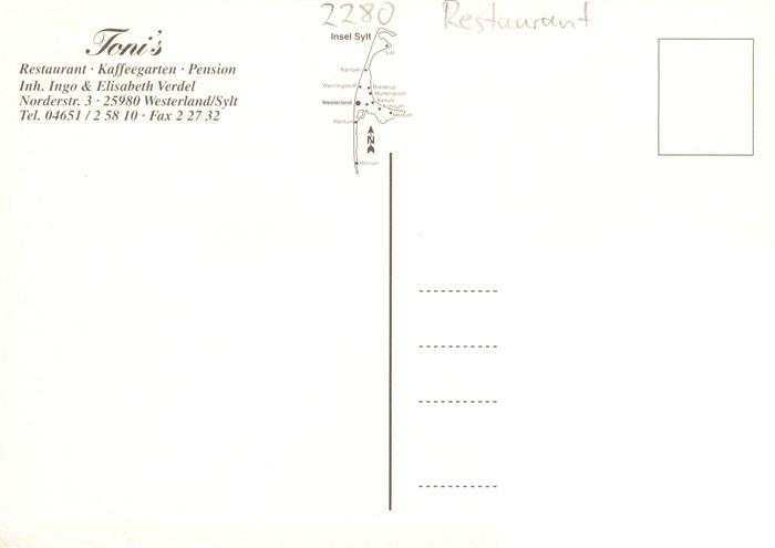 73894546 Westerland Sylt Toni’s Restaurant Kaffeegarten Pension Gastraeume Terrasse postalisch nicht gelaufen Erhaltung siehe scans [WerneD78] KatCode: 11110001054151