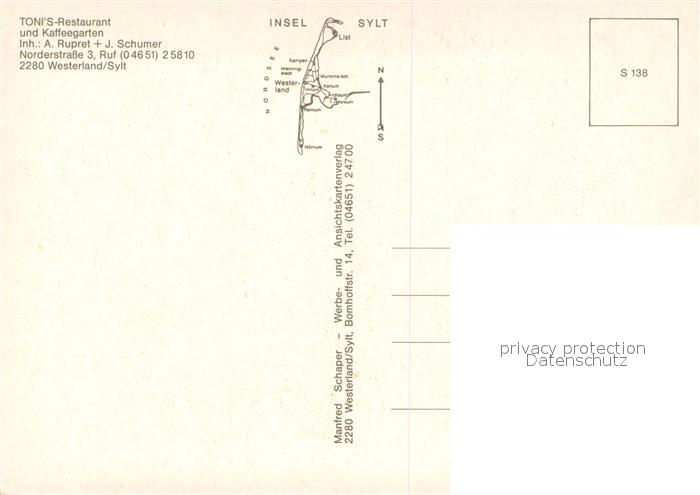 73726309 Westerland Sylt Tonis Restaurant und Gaestehaus Kaffeegarten postalisch nicht gelaufen Erhaltung siehe scans [FriedD77] KatCode: 11110001054151