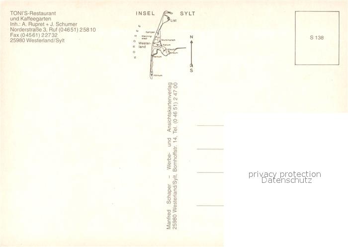 73332196 Westerland Sylt Tonis Restaurant und Gaestehaus postalisch nicht gelaufen Erhaltung siehe scans [LiesaD40] KatCode: 11110001054151