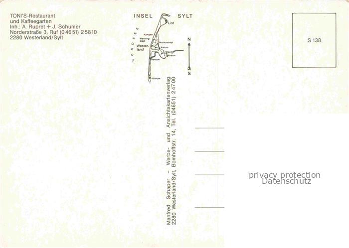 74096039 WESTERLAND Sylt Toni’s Restaurant und Kaffeegarten postalisch nicht gelaufen Erhaltung siehe scans [WerneD78] KatCode: 11110001054151