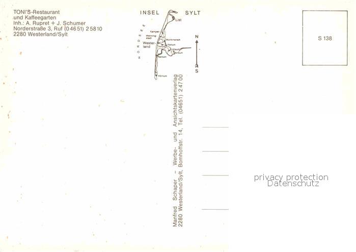 72673801 Westerland Sylt Tonis Restaurant postalisch nicht gelaufen Erhaltung siehe scans [AndreD76] KatCode: 11110001054151