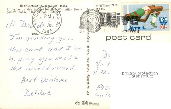 73131589 old postcard Westfield Massachusetts Stanley Park postalisch gelaufen Erhaltung siehe scans [KathaD81] KatCode: 14140230000000