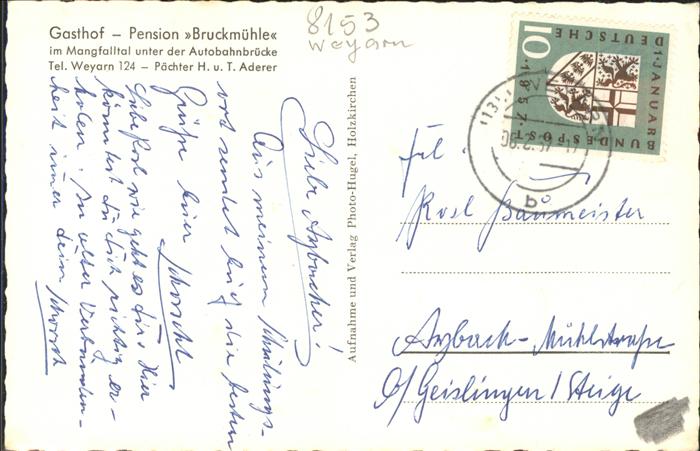 41263570 Weyarn Miesbach Bayern Gasthof Pensino Bruckmuehle Bruecke postalisch gelaufen gute Erhaltung Alte Ansichtskarte Postkarte alte Postkarte Stef Katcode 11110009182137