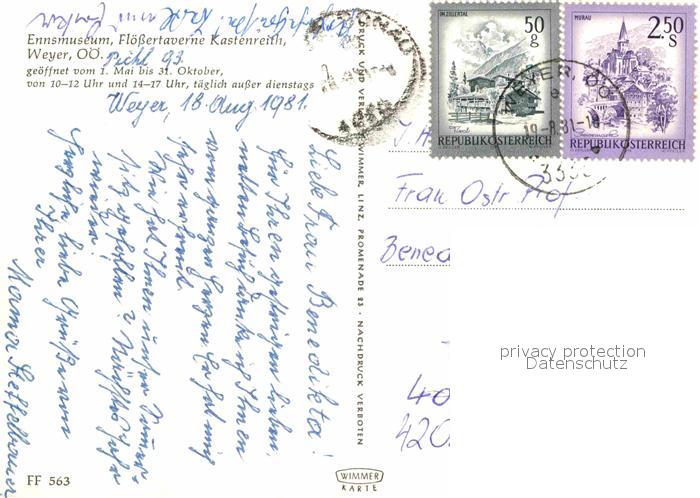72617731 alte Postkarte Weyer Enns Ennsmuseum Floessertaverne Kastenreith postalisch gelaufen Erhaltung siehe scans [NatalD47] KatCode: 11390314041522