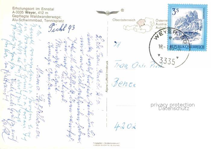 72673367 alte Postkarte Weyer Enns Ennstal Fliegeraufnahme postalisch gelaufen Erhaltung siehe scans [FriedD77] KatCode: 11390314041522