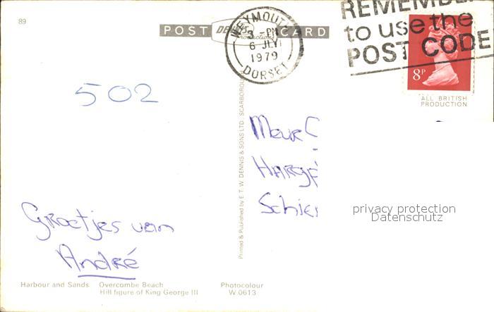 old postcard Weymouth Dorset Harbour and Sands Overcombe Beach Hill figure of King George III postalisch gelaufen Erhaltung siehe scans
