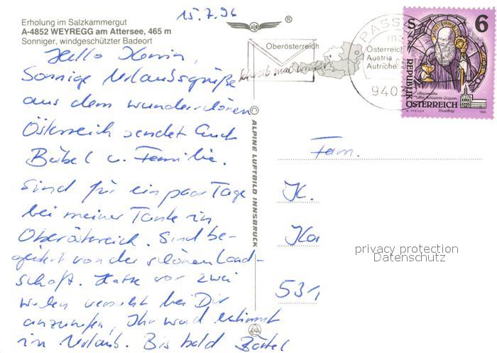 73360636 alte Postkarte Weyregg Attersee Alpenpanorama Fliegeraufnahme postalisch gelaufen Erhaltung siehe scans [FriedD77] KatCode: 11390315041749
