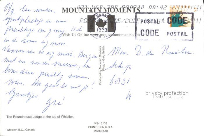 old postcard Whistler Roundhouse Lodge postalisch gelaufen Erhaltung siehe scans