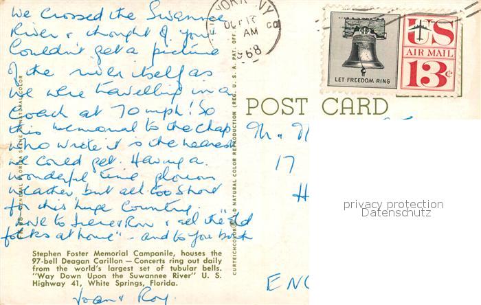 73127736 old postcard White Springs Stephen Foser Memorial Campanile postalisch gelaufen Erhaltung siehe scans [KathaD81] KatCode: 14140110000000