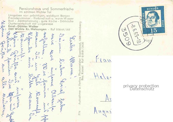 74144194 alte Postkarte Wichte Morschen-Wichte Fuldatal Melsungen Hessen Pensionshaus Ernst Guenter Walter postalisch gelaufen Erhaltung siehe scans [SanaeD93] KatCode: 11110006634015
