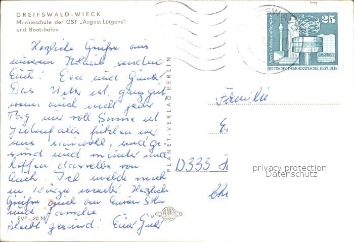 72010595 alte Postkarte Wieck Greifswald Fliegeraufnahme Hafen Marineschule der GST Augus Luetgens postalisch gelaufen Erhaltung siehe scans KatCode: 11110013001000