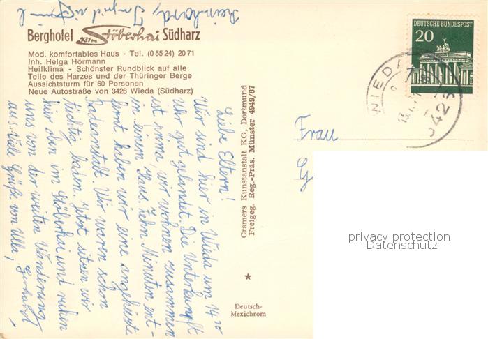 73752452 alte Postkarte Wieda Berghotel Stoeberhai Suedharz Fliegeraufnahme postalisch gelaufen Erhaltung siehe scans [WerneD78] KatCode: 11110003156013