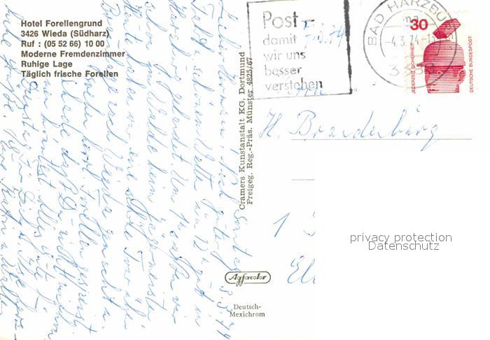 72797885 alte Postkarte Wieda Hotel Forellengrund postalisch gelaufen Erhaltung siehe scans [KathaD81] KatCode: 11110003156013